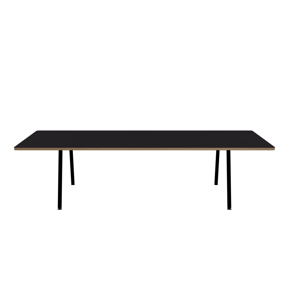 DIN PLUS Tisch - Form Eckig - Länge 300,00 cm - Tiefe 150,00 cm - Radius 4,00 cm - Stärke 3 cm - Oberseite Linoleum, 4166 Charcoal - Kern Stäbchenplatte - Kante Holz, Eiche - Kantenschräge 90° / DIN PLUS Tischgestell - Materialien und Farben Pulverbeschichteter Stahl, Jet Black (RAL 9005) - Länge 206 cm - Breite XL - Tischbeinprofil Rund - Set 2 Stück