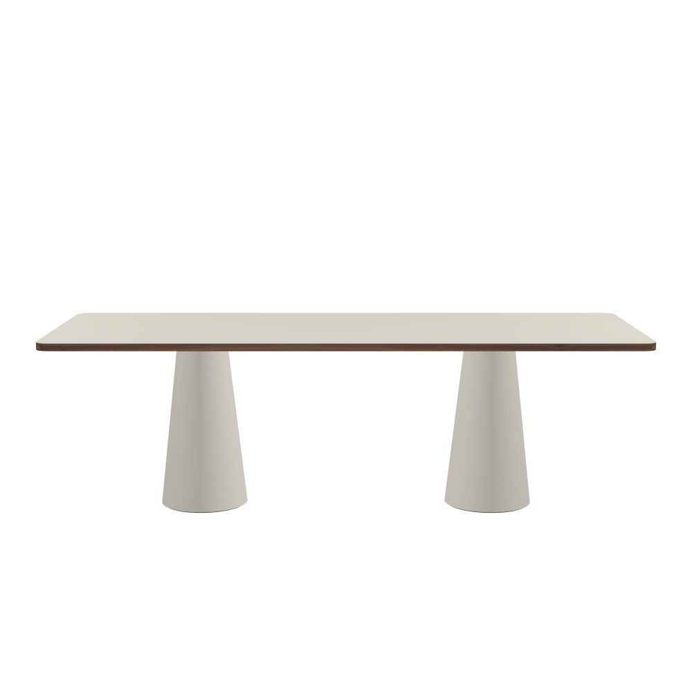 ALT Table - Shape Square - Length 240,00 cm - Width 90,00 cm - Radius 5,00 cm - Thickness 3 cm - Freeform 1.00000000 - Surface Linoleum, 4176 Mushroom - Core Laminboard - Edge Wood, Walnut - Profile Edge 90° / ALT Table Stand - Surface Linoleum, 4176 Mushroom - Size S: Ø 36 × H 72 cm